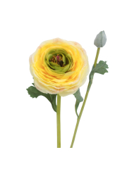Envie d'un bouquet printanier ? Laissez-vous tenter par cette magnifique renoncule artificielle à la couleur jaune lumineuse, dotée d'une fleur pleine de rondeur et d'un bouton encore fermé. Les pétales bien serrés laissent entrevoir un cœur vert et jaune avec une pointe de rouge. Les feuilles largement découpées sont duveteuses. La première se situe à environ 42,5 cm de la base.