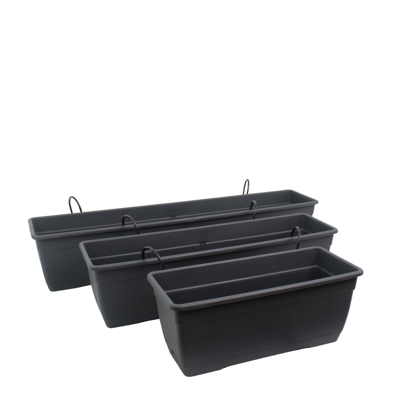 Côté look, elle arbore un style très classique avec une ligne sobre, un coloris gris anthracite passe-partout et une déclinaison en 4 tailles différentes. Livrée prête à poser avec son accessoire de suspension amovible en métal laqué noir, elle se place vers l'intérieur ou l'extérieur du balcon. Ce bac à suspendre convient pour tous les appuis dont l'épaisseur ne dépasse pas 13 cm.
