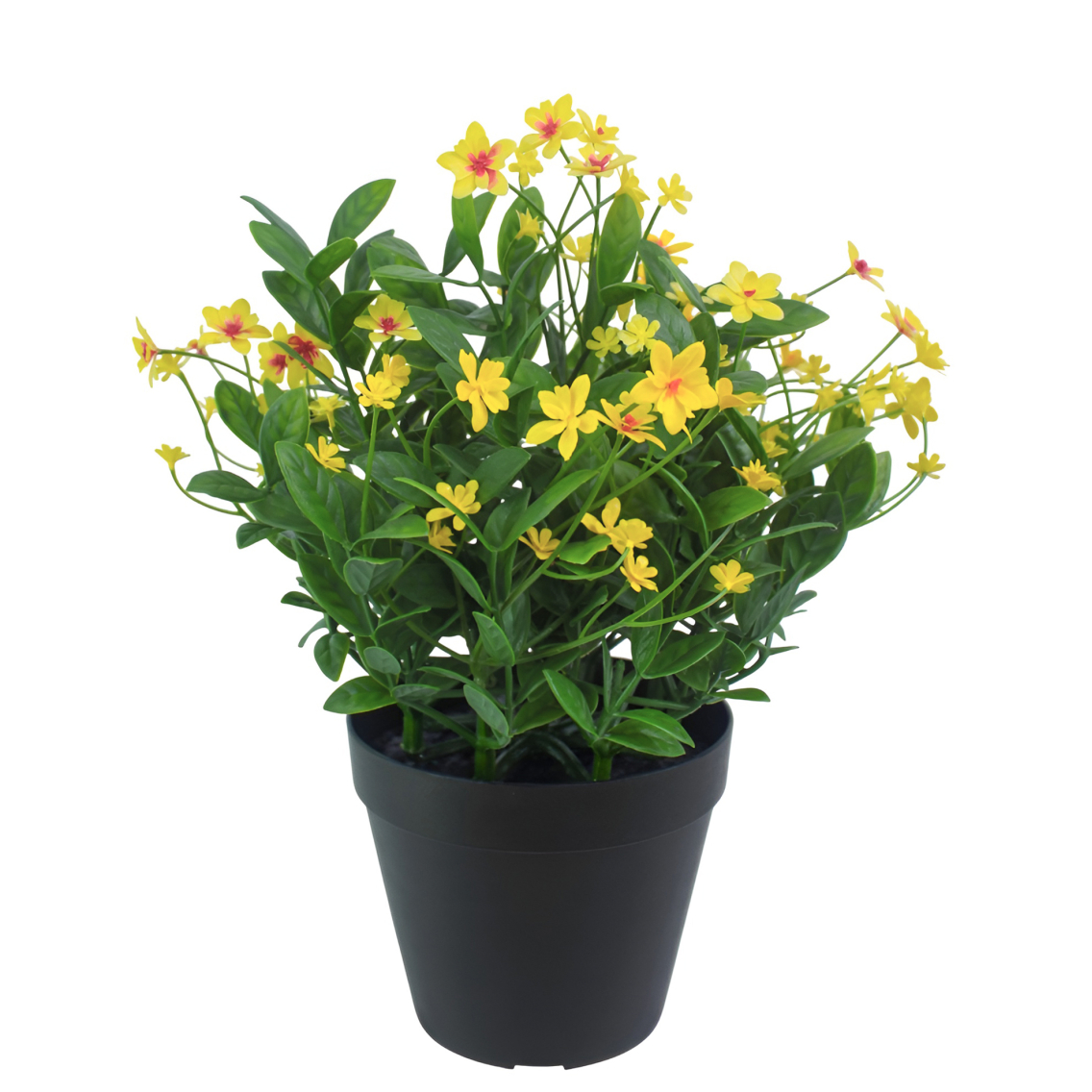 Hélianthe artificielle jaune de 30 cm de haut pot compris pour environ 25 cm de large. Plante fleurie pour extérieur avec feuillage touffu pourvu d'une multitude de petites fleurs. Joli rendu visuel, parfaite pour décorer les petites fenêtres. Disponible dans plusieurs coloris.