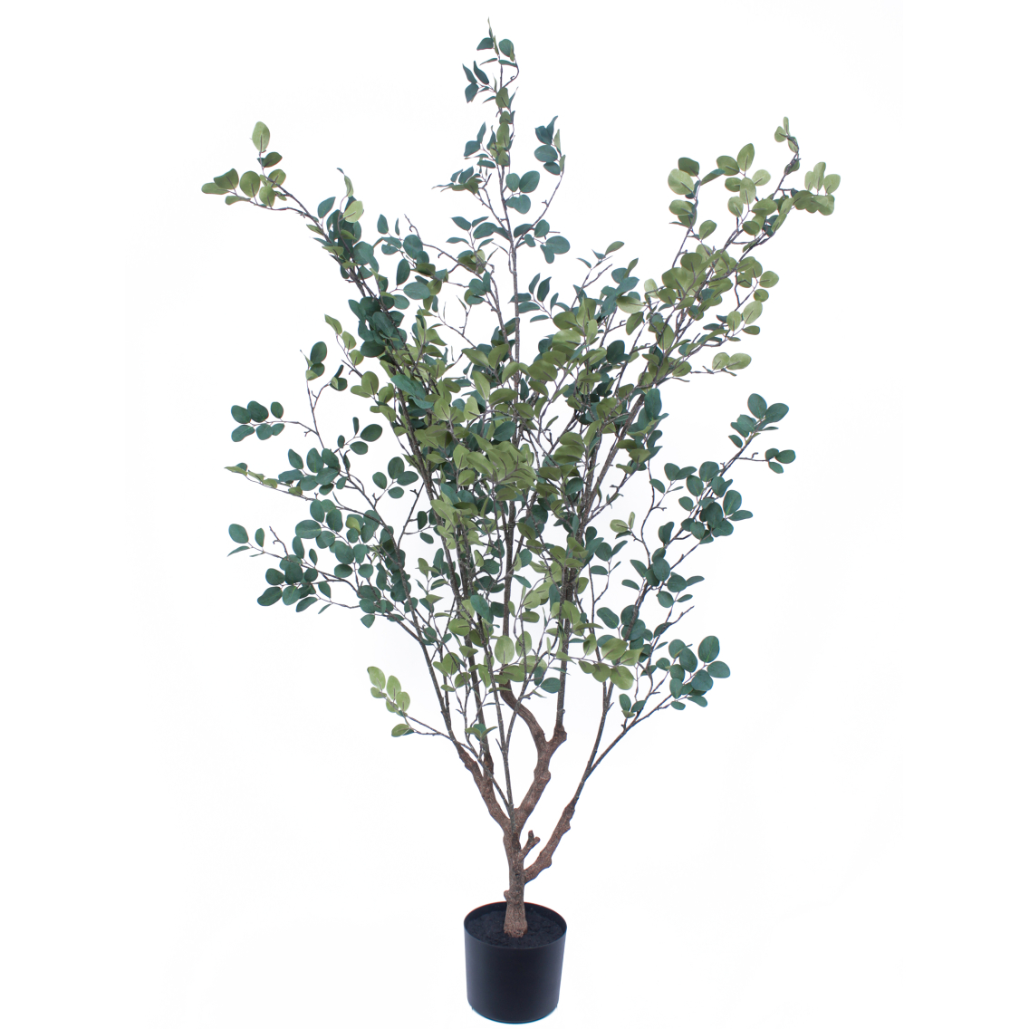 L'arbre est livré fixé dans un pot standard en PVC noir avec une imitation de terreau à la surface du pot. Il comporte un tronc de 3 cm de diamètre environ, conçu en polyéthylène dont la surface reproduit l'aspect très réaliste du vrai tronc. Il présente des ramifications lui conférant un aspect buissonnant, la première se situant à environ 22 cm de la base. Il porte un splendide feuillage en polyester composé de petites feuilles ovales de couleur vert glauque, fixées sur des tiges armées à mémoire de forme recouvertes de polyéthylène. L'envergure de l'arbre s'ajuste en manipulant doucement les tiges. La hauteur sous feuillage est d'environ 50 cm par rapport à la base.